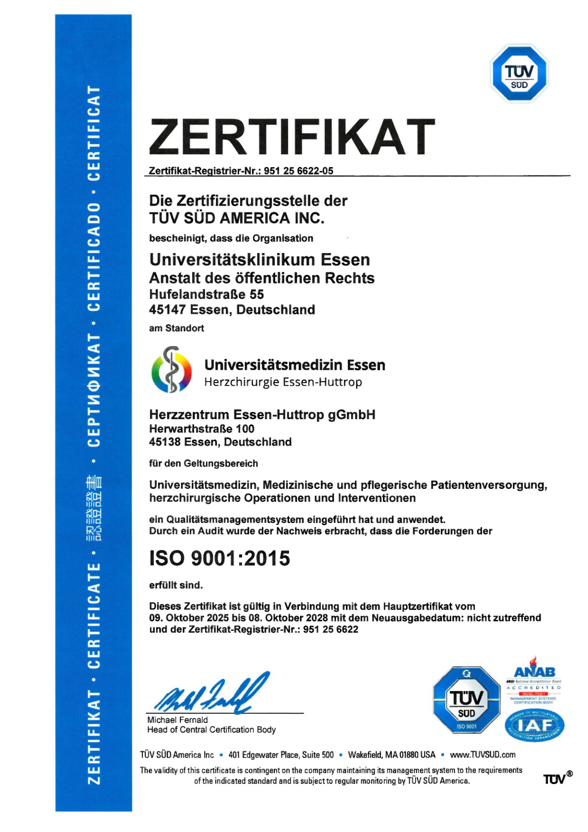 Aufgrund der erfolgreichen Begehung des Standortes haben die Auditoren der DEKRA Certification GmbH dem Herzzentrum Essen-Huttrop gGmbH das Zertifikat für ein erfolgreich implementiertes und ISO 9001 konformes QM-System erteilt und ausgestellt.